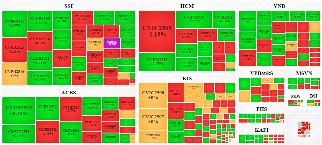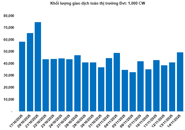 Khối lượng giao dịch toàn thị trường trong phiên 14/11 đạt 49.41 triệu CW, tăng 20.33%; giá trị giao dịch đạt 85.87 tỷ đồng, tăng 23.61% so với phiên 13/11. Trong đó, CSTB2528 là mã dẫn đầu thị trường về khối lượng với 2.92 triệu CW; CVNM2511 dẫn đầu về giá trị giao dịch với 5.62 tỷ đồng.