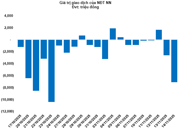 Kết thúc phiên giao dịch ngày 14/11/2025, toàn thị trường có 121 mã tăng, 139 mã giảm và 41 mã tham chiếu. Khối ngoại tiếp tục bán ròng với tổng mức bán ròng đạt 7.08 tỷ đồng.