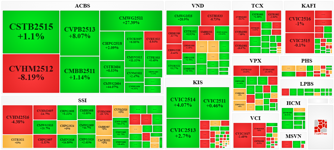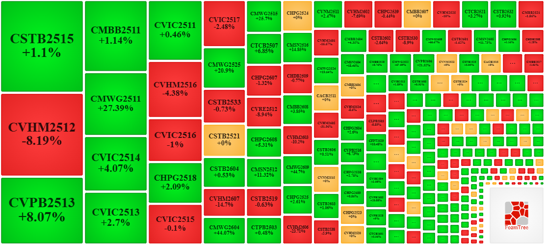 Trong phiên giao dịch ngày 17/04/2026 thị trường diễn biến phân hóa nhưng bên mua có phần lấn lướt hơn khiến phần lớn các mã chứng quyền tăng giá. Cụ thể, các mã chứng quyền lớn trong nhóm tăng giá là CSTB2515, CVPB2513, CMBB2511 và CMWG2511.