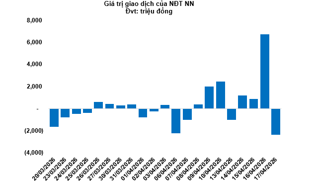 Kết thúc phiên giao dịch ngày 17/04/2026, toàn thị trường có 142 mã tăng, 78 mã giảm và 46 mã tham chiếu. Khối ngoại quay lại bán ròng với tổng mức bán ròng đạt 2.37 tỷ đồng.