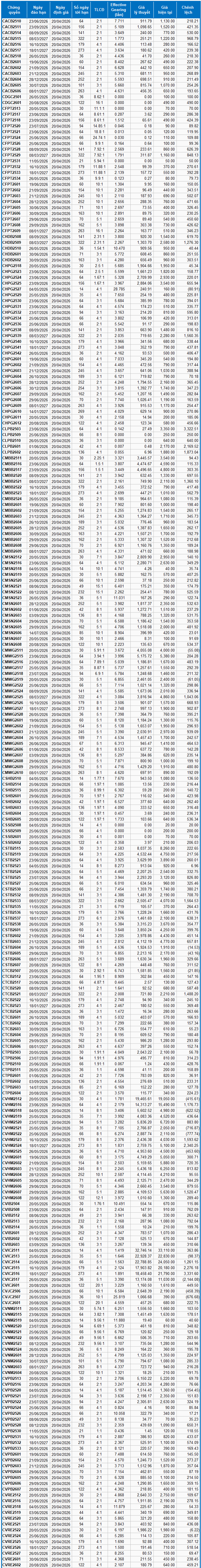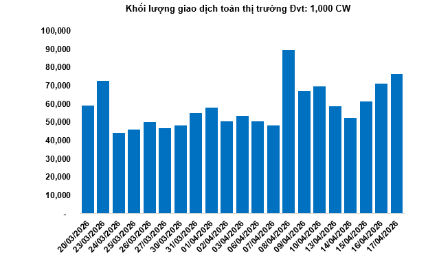 Khối lượng giao dịch toàn thị trường trong phiên 17/04 đạt 76.46 triệu CW, tăng 7.54%; giá trị giao dịch đạt 112.74 tỷ đồng, tăng 4.43% so với phiên 16/04. Trong đó, CMWG2608 là mã dẫn đầu thị trường về khối lượng với 4.22 triệu CW; CVHM2516 dẫn đầu về giá trị giao dịch với 12.1 tỷ đồng.