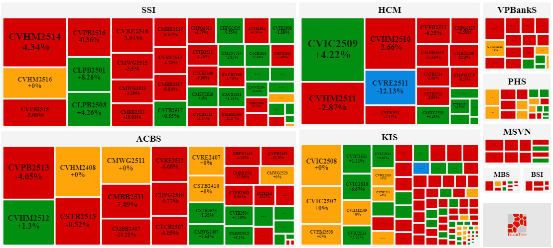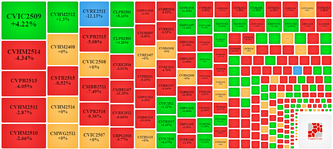 Trong phiên giao dịch ngày 24/10/2025, bên bán quay lại dẫn dắt thị trường khiến phần lớn các mã chứng quyền giảm giá. Cụ thể, các mã chứng quyền lớn trong nhóm giảm giá là CVHM2514, CVPB2513, CVHM2511, CVHM2510 và CSTB2515.