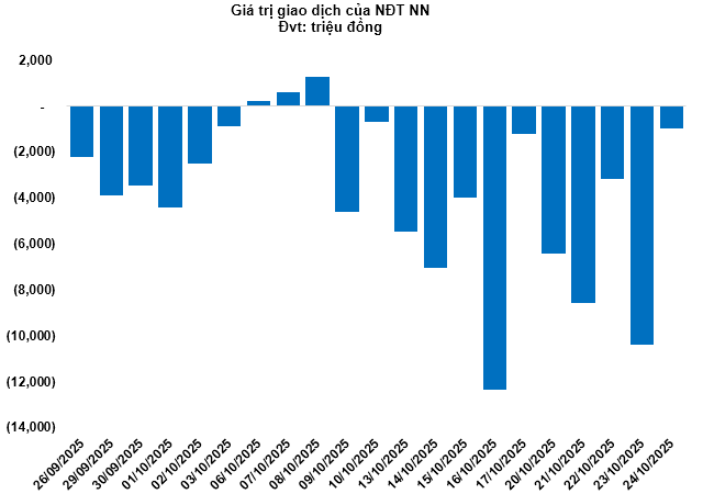Kết thúc phiên giao dịch ngày 24/10/2025, toàn thị trường có 77 mã tăng, 140 mã giảm và 37 mã tham chiếu. Khối ngoại tiếp tục bán ròng với tổng mức bán ròng hơn 991 triệu đồng.