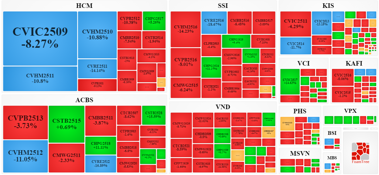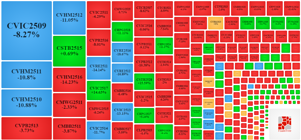 Trong phiên giao dịch ngày 26/12/2025, bên bán tiếp tục áp đảo thị trường khiến phần lớn các mã chứng quyền giảm giá. Cụ thể, các mã chứng quyền lớn trong nhóm giảm giá là CVIC2509, CVHM2511, CVPB2513 và CMWG2511.