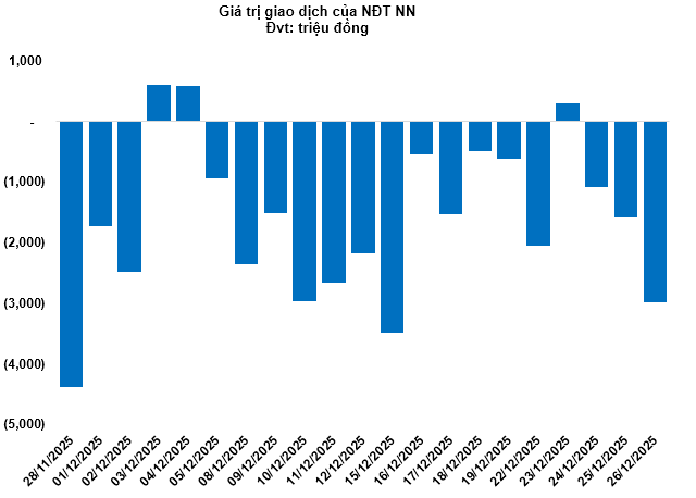 Kết thúc phiên giao dịch ngày 26/12/2025, toàn thị trường có 61 mã tăng, 175 mã giảm và 23 mã tham chiếu. Khối ngoại tiếp tục bán ròng với tổng mức bán ròng đạt 2.98 tỷ đồng.