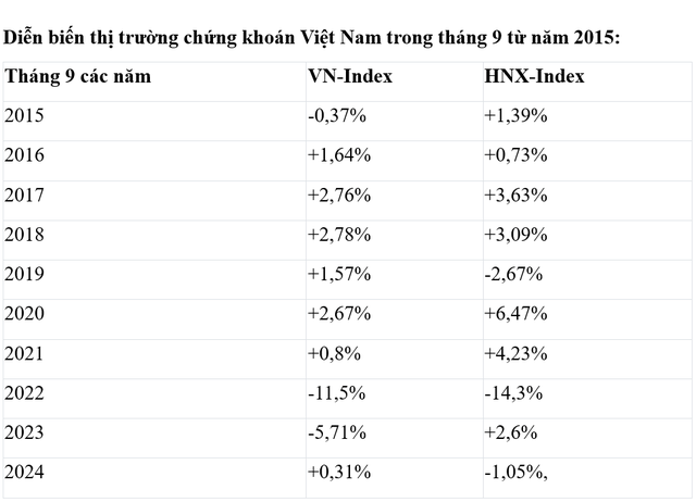 Tháng 9 gần nhất vào năm 2024, thị trường giao dịch khá ảm đạm, chỉ số VN-Index tăng nhẹ từ gần 1.284 điểm lên 1.288 điểm, tương đương +0,31%.
