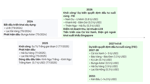 Trong đó, năm 2026 là “điểm rơi” quan trọng với hàng loạt mốc FID (quyết định đầu tư cuối cùng) cho các dự án lớn như Nam Du – U Minh (0.8 tỷ USD), Khánh Mỹ – Đầm Dơi (0.3 tỷ USD), Thiên Nga – Hải Âu (0.3 tỷ USD).