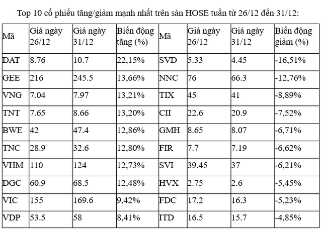 Cùng với đó, cổ phiếu GEE tiếp tục cho thấy sức bật mạnh mẽ khi có tuần thứ hai liên tiếp thuộc nhóm tăng cao nhất sàn. Tuần trước, cổ phiếu GEE tăng hơn 17%. Cùng với đó, GEE kết thúc năm 2025 cũng trở thành quán quân tăng giá, khi tăng hơn 800%.