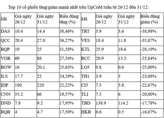 Trên UpCoM, nhóm các cổ phiếu tăng, giảm mạnh nhất thêm một tuần ghi nhận không có biến động quá lớn về thanh khoản, hầu hết chỉ khớp lệnh ở mức thấp trong các phiên giao dịch.