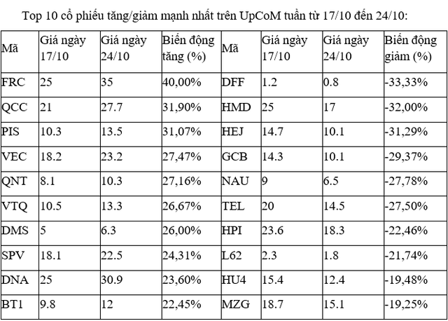 Trên UpCoM, hầu như các cổ phiếu biến động mạnh nhất về giá tiếp tục có tuần giao dịch ảm đạm. Ngoại trừ hai cổ phiếu VEC ở chiều tăng và DFF ở chiều giảm khi có những phiên thanh khoản tương đối cao.