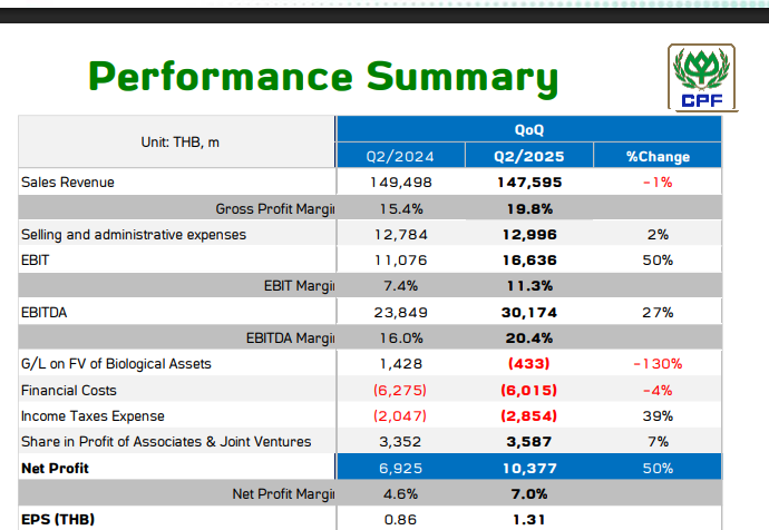 Trong quý 2/2025, “ông trùm” chăn nuôi Thái Lan ghi nhận tổng doanh thu gần 147.6 tỷ Baht, giảm 1% so với cùng kỳ. Tuy nhiên, lãi ròng vẫn tăng mạnh 50% lên 10.4 tỷ Baht, chủ yếu nhờ biên lãi cải thiện đáng kể nhờ đà tăng của giá thịt heo và giá gia cầm.