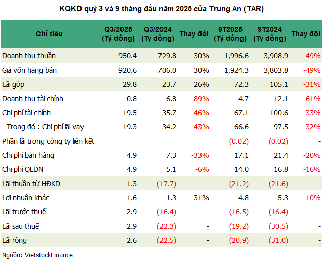 Trung An ghi nhận tín hiệu phục hồi khi chấm dứt chuỗi 5 quý liên tiếp thua lỗ, đạt lãi ròng 2.6 tỷ đồng trong quý 3/2025, đảo chiều từ mức âm 22.5 tỷ đồng cùng kỳ năm trước. Doanh thu quý này đạt hơn 950 tỷ đồng, tăng 30% và là mức cao nhất trong 1 năm qua, biên lãi gộp duy trì trên 3%, mức thấp vốn có do đặc thù ngành lúa gạo.
