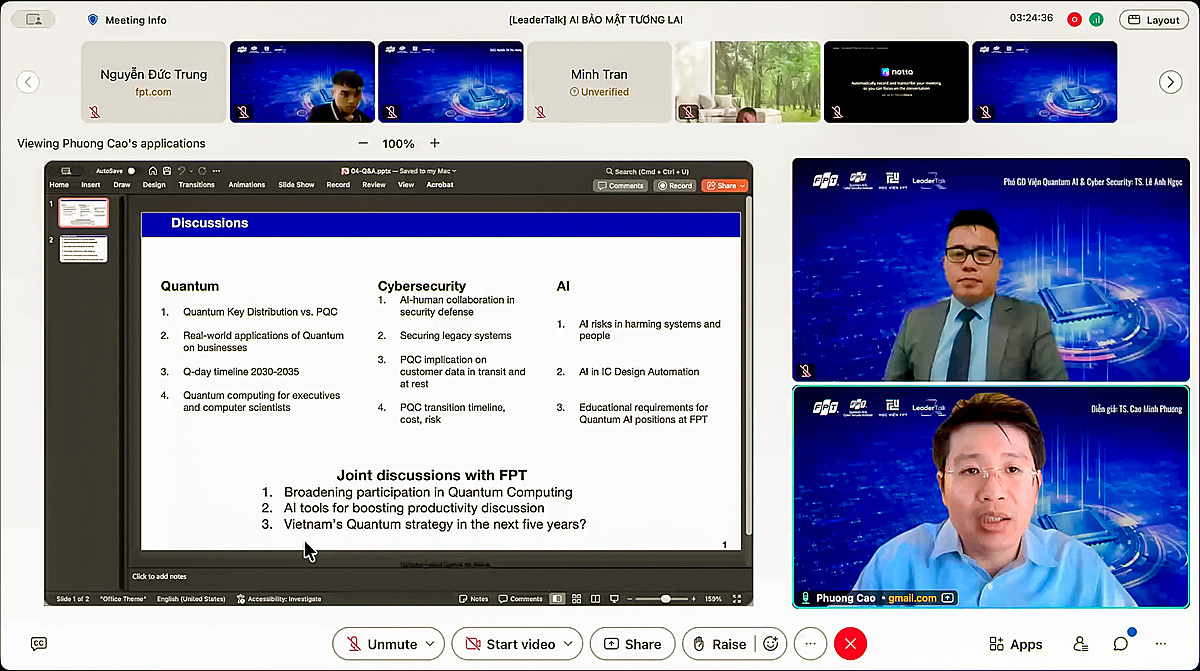 “FPT có thể chủ động triển khai đo đạc và nâng cấp chuẩn hậu lượng tử ngay trên hạ tầng sẵn có. Việc tiên phong làm chủ công nghệ này không chỉ củng cố tấm khiên bảo mật mà còn là minh chứng mạnh mẽ nhất để khẳng định vị thế dẫn dắt và làm chủ công nghệ của FPT trên thị trường”, TS. Cao Minh Phương gợi mở.