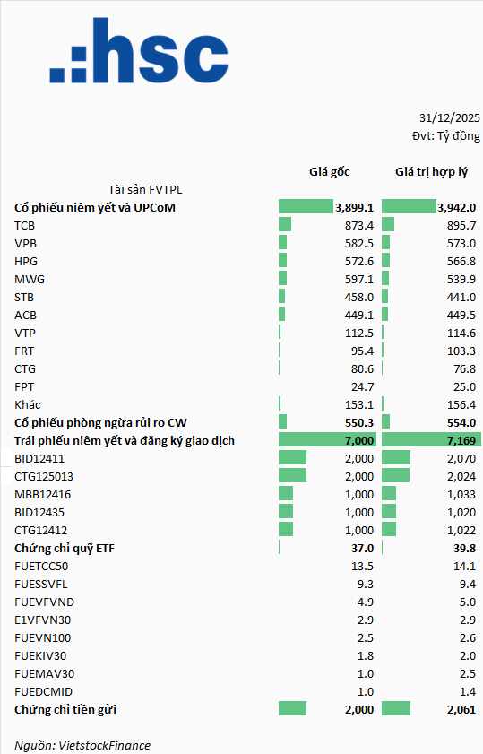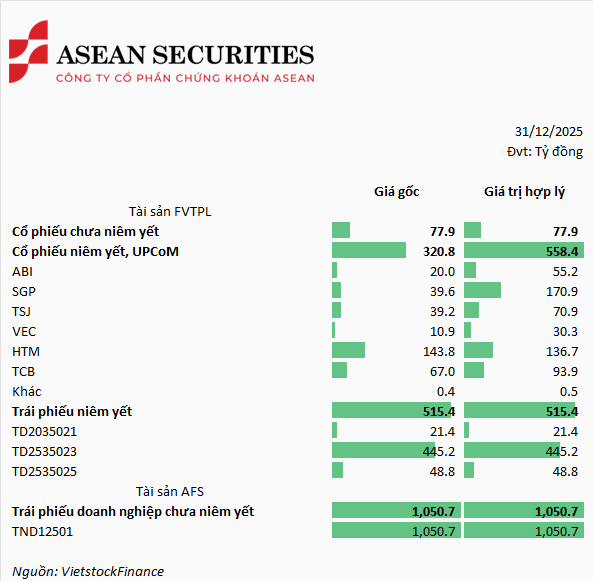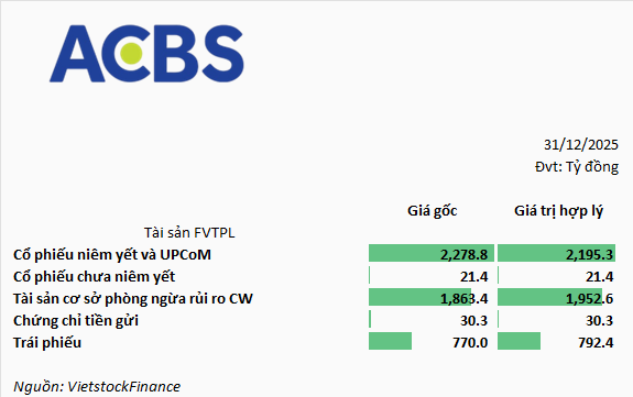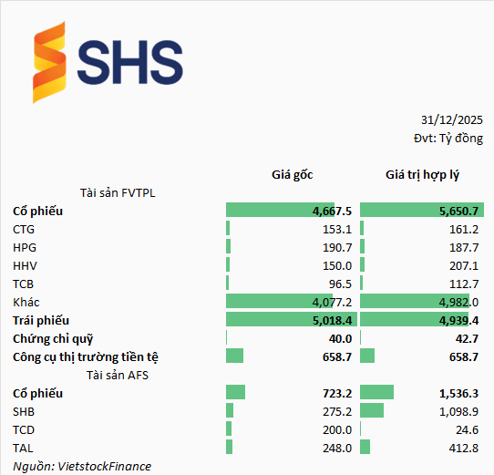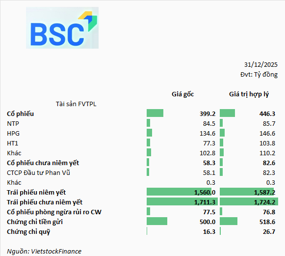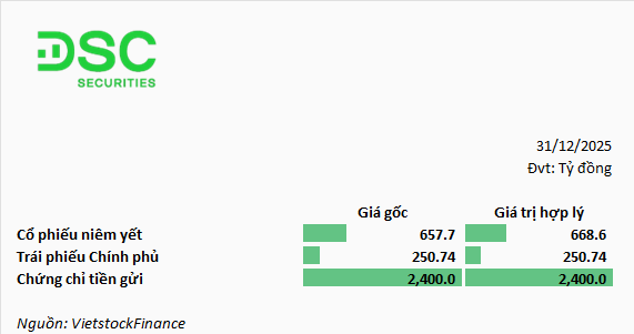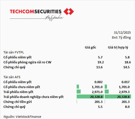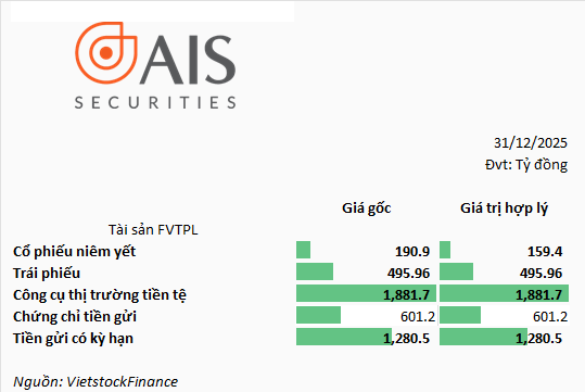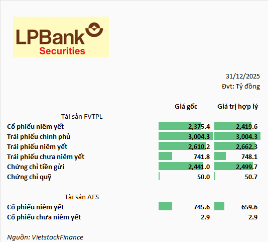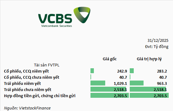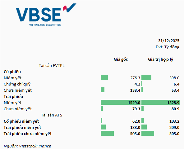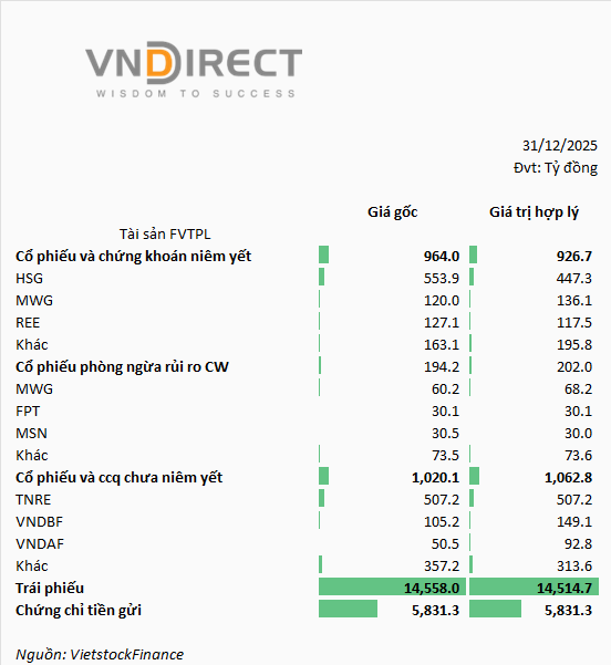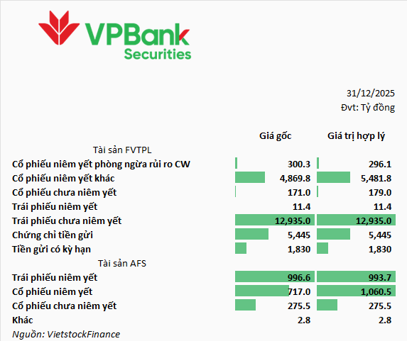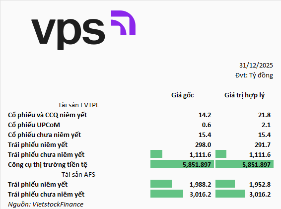 Khối tài sản tài chính FVTPL và tài sản tài chính sẵn sàng để bán (AFS) của VPBankS đã phình to lên nhanh chóng. Tới cuối năm 2025, Công ty tập trung nắm giữ gần 14 ngàn tỷ đồng trái phiếu niêm yết (tính cả FVTPL và AFS), gần 5.5 ngàn tỷ đồng cổ phiếu niêm yết, hơn 7.2 ngàn tỷ đồng chứng chỉ tiền gửi và tiền gửi có kỳ hạn. Trong đó, danh mục cổ phiếu niêm yết đang ghi lãi 17%.
