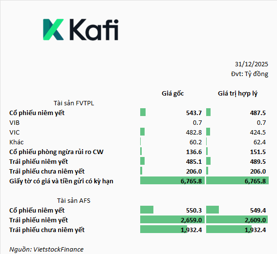 Chứng khoán Kafi cũng ở nhóm tập trung danh mục vào các tài sản rủi ro thấp. Giá trị đầu tư 6.7 ngàn tỷ đồng giấy tờ có giá và tiền gửi có kỳ hạn, 2.65 ngàn tỷ đồng trái phiếu niêm yết và 1.9 ngàn tỷ đồng trái phiếu chưa niêm yết.