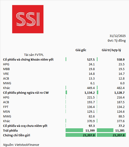 Danh mục của SSI tiếp tục tập trung phần lớn vào các tài sản rủi ro thấp như chứng chỉ tiền gửi, trái phiếu với giá trị lần lượt hơn 23.2 ngàn tỷ đồng và gần 13.3 ngàn tỷ đồng. Công ty chỉ còn nắm giữ hơn 527 tỷ đồng cổ phiếu và 1.1 ngàn tỷ đồng cổ phiếu phòng ngửa rủi ro cho chứng quyền có đảm bảo (CW). So với đầu năm, quy mô cổ phiếu trong danh mục tài sản tài chính ghi nhận qua lãi/lỗ (FVTPL) của SSI đã giảm mạnh từ mức 1.6 ngàn tỷ đồng về còn như hiện tại.