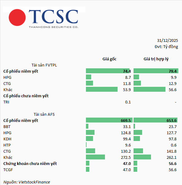 Chứng khoán TCSC thì hoàn toàn tập trung đầu tư vào cổ phiếu. Danh mục nổi bật với các mã như HPG, KDH, HTP, CTG.