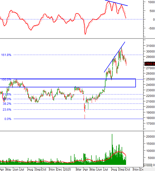 Trong phiên giao dịch ngày 03/10/2025, giá cổ phiếu HPG tiếp tục đi xuống sau khi test ngưỡng Fibonacci Retracement 161.8% (tương đương vùng 29,000-29,500) vào tuần trước.