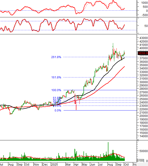 Giá cổ phiếu CTD tiếp tục hồi phục trong phiên giao dịch ngày 03/10/2025 và vượt qua cả hai đường SMA 50 ngày và SMA 100 ngày.