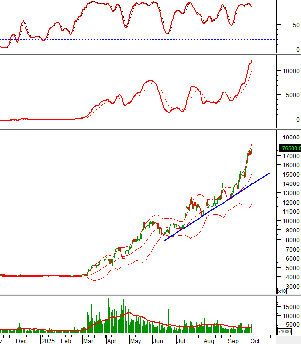 Giá cổ phiếu VIC tiếp tục đà tăng trong phiên giao dịch ngày 03/10/2025 và tiến sát Upper Band của Bollinger Bands.