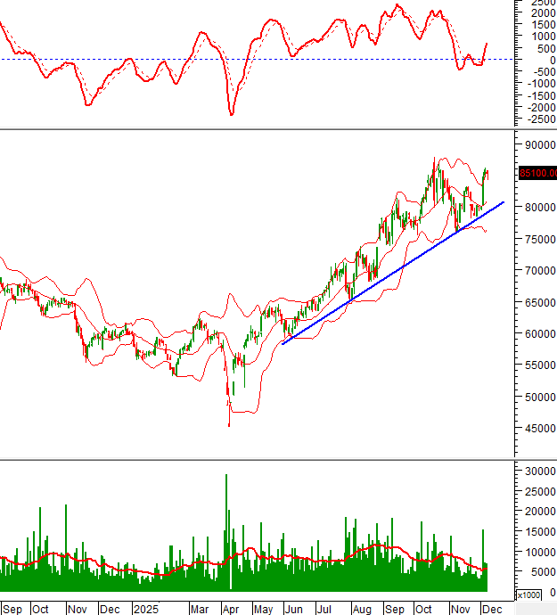 Giá cổ phiếu MWG giằng co mạnh trong phiên giao dịch ngày 05/12/2025 và vẫn còn bám vào Upper Band của Bollinger Bands.