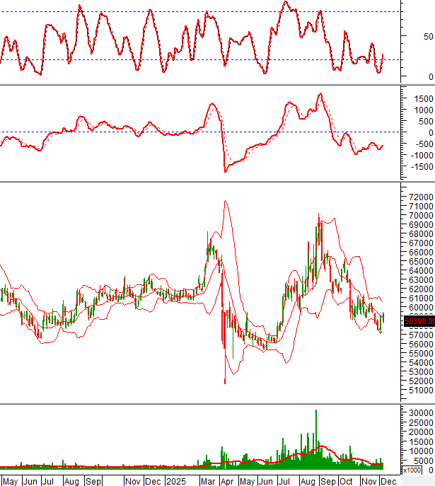 Giá cổ phiếu VCB giảm trở lại trong phiên giao dịch ngày 05/12/2025 sau khi test lại đường Middle của Bollinger Bands.