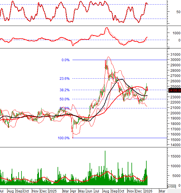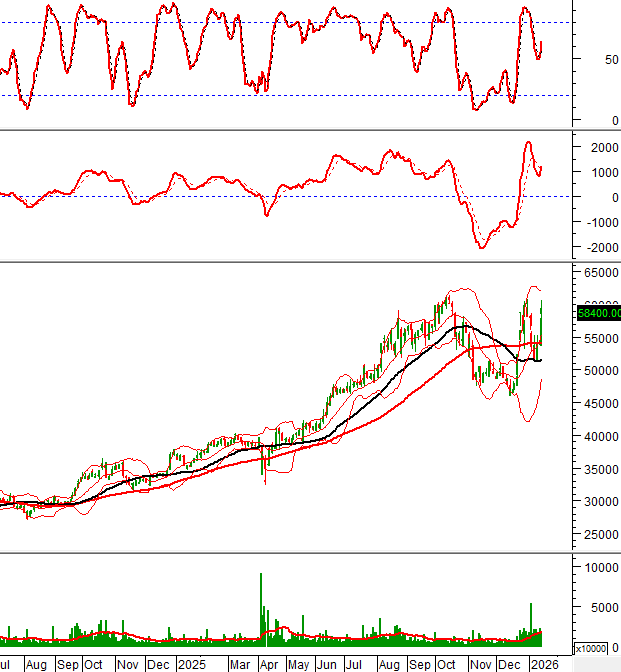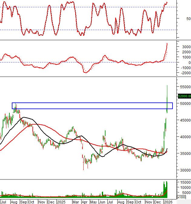 Giá đã vượt qua đỉnh cũ tháng 08/2024 (tương đương vùng 48,500-50,000). Theo lý thuyết phân tích kỹ thuật, vùng này sẽ chuyển từ kháng cự thành hỗ trợ trong các phiên tới.
