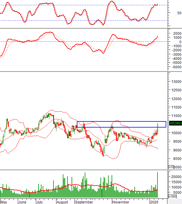 Giá đang test lại đỉnh cũ tháng 09/2025 và tháng 11/2025 (tương đương vùng 103,000-106,500). Nếu phá vỡ được vùng này thì xu hướng tăng sẽ càng được củng cố.