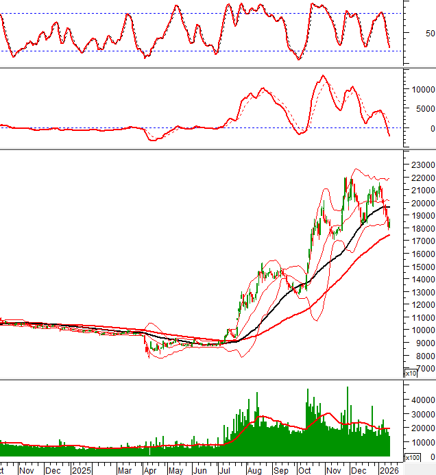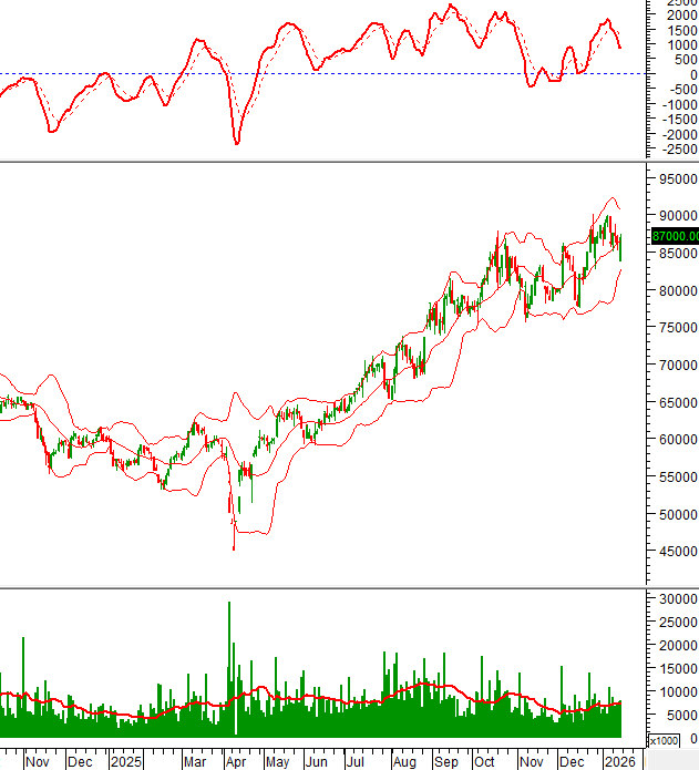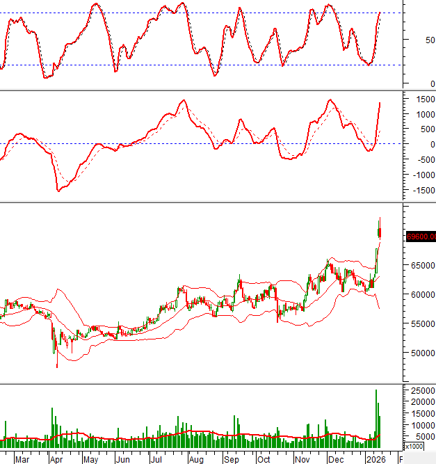 Trong phiên giao dịch ngày 16/01/2026, giá cổ phiếu VJC tăng nhẹ nhưng vẫn còn bám vào Lower Band của Bollinger Bands.