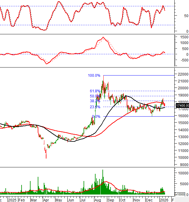 Giá cổ phiếu VNM giảm trở lại trong phiên giao dịch ngày 16/01/2026 và tiếp tục xuất hiện cây nến có bóng mờ bên trên khá dài cho thấy áp lực bán ra tăng.