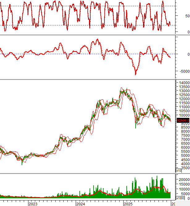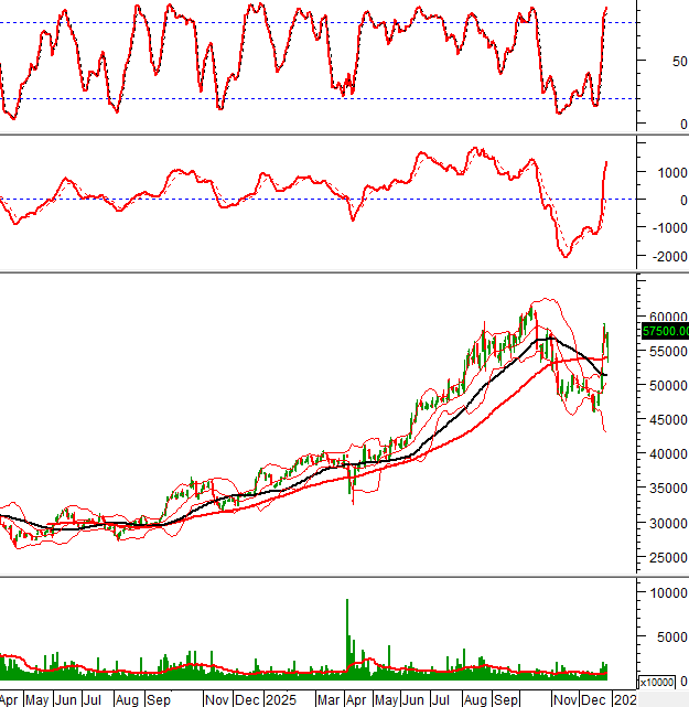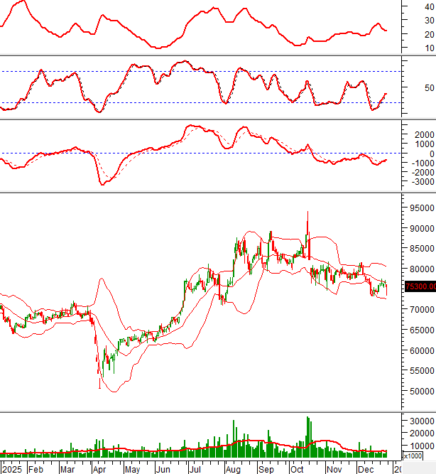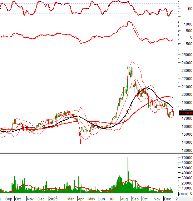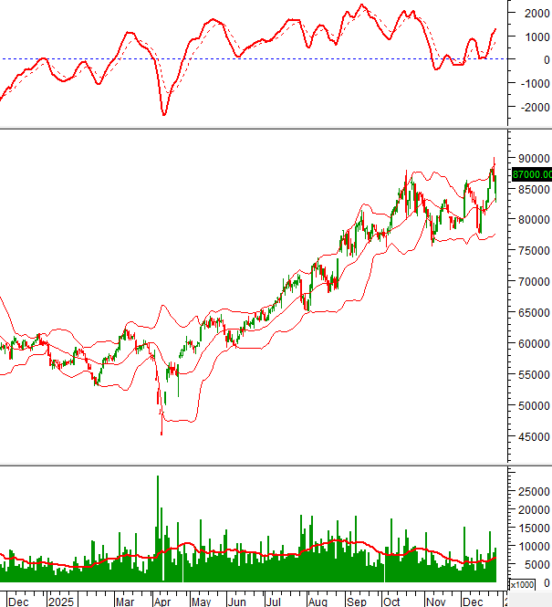 Giá chưa thể vượt qua đường Middle của Bollinger Bands dù đã test vài lần từ cuối tháng 11/2025 đến nay.
