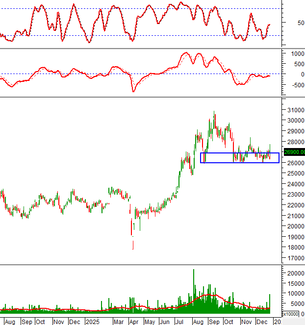 Đáy cũ tháng 10/2025 (tương đương vùng 26,000-27,000) đang đóng vai trò hỗ trợ mạnh. Việc mua vào trong vùng này được ủng hộ.