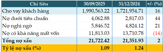 Tổng nợ xấu tính đến 30/09/2025 của Ngân hàng tăng nhẹ 2% so với đầu năm, chiếm hơn 21,722 tỷ đồng. Trong đó, nợ có khả năng mất vốn cải thiện. Kết quả, tỷ lệ nợ xấu/dư nợ giảm từ mức 1.24% đầu năm xuống còn 1.09%.