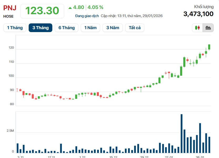 Trên thị trường chứng khoán, ở phiên sáng 29/1/2026, thị giá PNJ đạt 123.300 đồng/cổ phiếu, tăng 4,05% so với tham chiếu. Tính từ nền giá tích lũy quanh vùng 94.000 đồng/cổ phiếu hồi đầu tháng 11, mã này đã ghi nhận mức tăng trưởng hơn 30%.