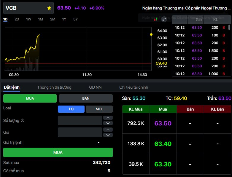 Phiên giao dịch buổi phiên sáng 23/4 ghi nhận diễn biến đáng chú ý tại cổ phiếu VCB của Vietcombank khi lực cầu tăng mạnh kéo cổ phiếu này tím trần ngay đầu buổi sáng. Ghi nhận lúc 10h15, cổ phiếu VCB được giao dịch ở mức 63.500 đồng/cp, tăng 6,9% so với tham chiếu.