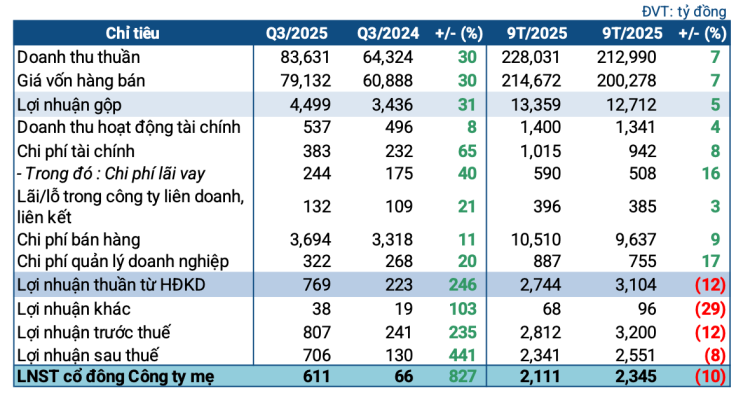 Doanh thu thuần lũy kế 9 tháng đầu năm 2025 đạt 11.413 tỷ đồng, tăng 40% so với 9 tháng đầu năm 2024. Nhờ doanh thu tài chính tăng mạnh gấp 20 lần, lợi nhuận sau thuế 9 tháng đầu năm đạt 3.783 tỷ đồng, tăng gấp 5 lần so với cùng kỳ 2024. Lợi nhuận sau thuế của công ty mẹ đạt 3.689 tỷ đồng, tăng gấp 6 lần so với cùng kỳ.