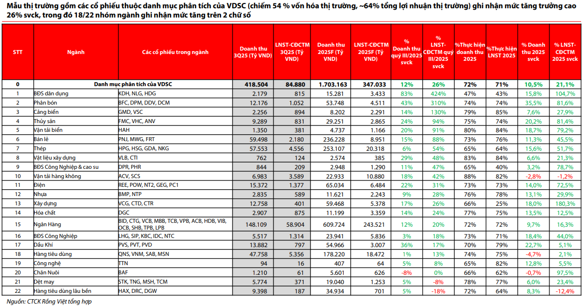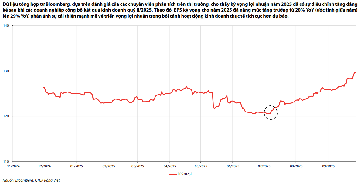 Theo kết quả khảo sát từ danh mục phân tích của VDSC, xu hướng tăng trưởng vẫn tích cực với lợi nhuận quý 3 dự kiến tăng 22% so với cùng kỳ, cao hơn mức dự phóng top-down 15%. Thị trường cũng đã điều chỉnh kỳ vọng 2025 lên mức tích cực hơn từ cuối tháng 7.