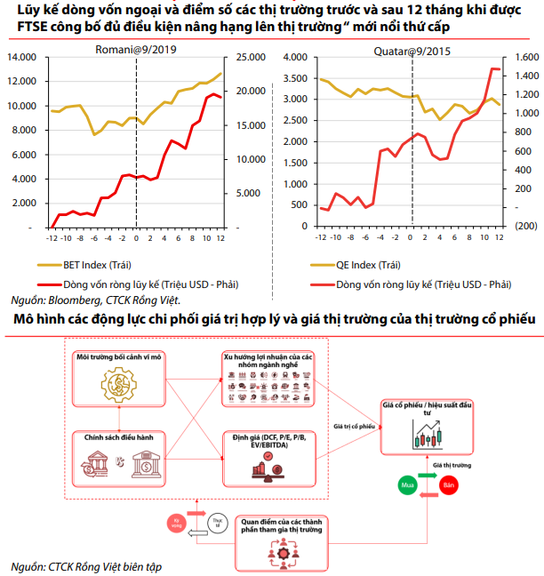 Cụ thể, dù được ghi nhận đủ điều kiện nâng hạng và có dòng tiền ngoại vào đáng kể, điểm số của thị trường giữa Romania (2019) và Qatar (2015) diễn biến khá khác nhau do bối cảnh vĩ mô toàn cầu ở hai thời điểm là khác nhau. Việc nâng hạng không ảnh hưởng trực tiếp đến hoạt động kinh doanh và triển vọng lợi nhuận của phần lớn doanh nghiệp niêm yết. Bên cạnh đó, định giá thị trường hiện tại chủ yếu vẫn được dẫn dắt bởi chính sách kích thích kinh tế trong nước, bao gồm tài khóa mở rộng và tiền tệ hỗ trợ.