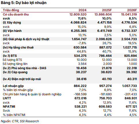 Cụ thể, mảng hạ tầng cho thuê ghi nhận mức tăng trưởng doanh thu mạnh nhất (tăng 41%). Tính đến cuối quý 3/2025, CTR sở hữu và quản lý 11,329 trạm BTS (tăng 29% so với cùng kỳ và 13% so với đầu năm), trong đó 385 trạm là trạm dùng chung (tăng 15%).