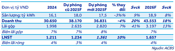 Cụ thể, ACBS dự phóng năm 2025, sản lượng của POW đạt 17.5 tỷ kWh, tăng 9% so với năm trước, doanh thu đạt 36,831 tỷ đồng, tăng 20%, lãi sau thuế đạt 1,361 tỷ đồng, tăng 12%, do nhiều chi phí tăng cao như lãi vay, khấu hao và vận hành, trong khi đó doanh thu & sản lượng chưa tăng theo tương ứng do cần thời gian khoảng 2 năm để nhà máy mới đi vào vận hành ổn định.