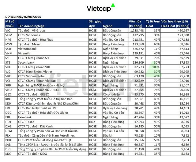 Các cổ phiếu Việt Nam đáp ứng tiêu chí sơ bộ của FTSE Global All Cap Index bao gồm: VIC, VHM, HPG, MSN, VCB, VNM, SSI, STB, VIX, VJC, VRE, VCI, SHB, VND, GEX, KBC, KDH, FRT, DGC, EIB, HUT, DXG, DPM, PLX, PDR, SAB, DIG và KDC. FTSE Russell sàng lọc cổ phiếu dựa trên nhiều tiêu chí như tỷ lệ room ngoại còn lại, quy mô vốn hóa, thanh khoản và tỷ lệ free float.