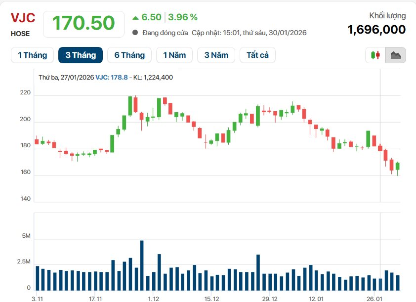 Phản ứng trước kết quả kinh doanh tích cực, trên thị trường chứng khoán, cổ phiếu VJC đã có phiên giao dịch khởi sắc. Kết phiên 30/1, VJC tăng 3,96% lên mức 170.500 đồng/cổ phiếu với thanh khoản sôi động gần 1,7 triệu đơn vị.
