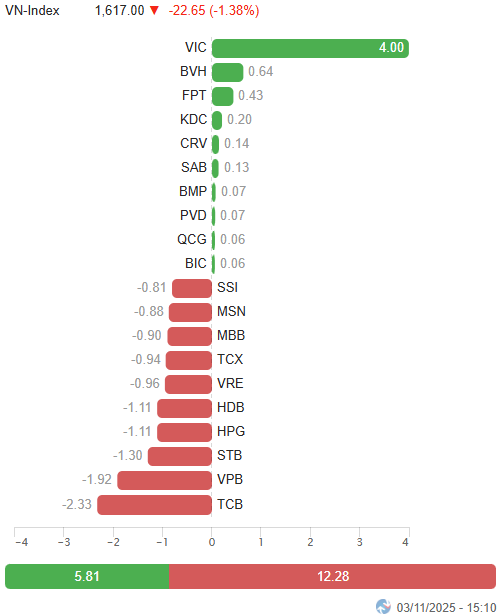 – Thị trường chứng khoán Việt Nam khởi đầu tháng 11 với một phiên giao dịch đầy sóng gió. Sau nửa đầu phiên sáng không mấy tích cực, nhóm cổ phiếu trụ bất ngờ hồi phục mạnh, kéo VN-Index từ mức giảm hơn 16 điểm đảo chiều tăng gần 12 điểm trước giờ nghỉ trưa. Tuy nhiên, kỳ vọng nhanh chóng bị dập tắt trong phiên chiều khi áp lực bán ồ ạt trở lại, lan rộng trên toàn thị trường và thậm chí khiến nhiều mã rơi vào trạng thái “trắng bên mua”. Kết phiên, VN-Index lùi về 1,617 điểm, giảm 22.65 điểm (-1.38%) so với phiên trước.