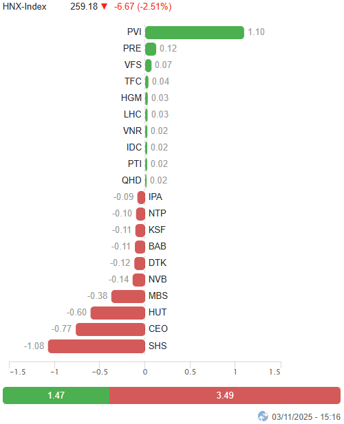 – Các chỉ số chính tiếp tục giảm mạnh trong phiên giao dịch ngày 03/11. Cụ thể, VN-Index giảm 1.38%, dừng ở mức 1,617 điểm; HNX-Index lao dốc 2.51%, xuống còn 259.18 điểm.