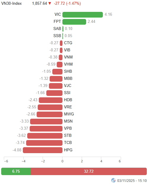 I. PHÂN TÍCH THỊ TRƯỜNG CHỨNG KHOÁN CƠ SỞ NGÀY 03/11/2025