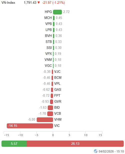 – VN-Index điều chỉnh mạnh trở lại trong phiên giao dịch 04/02 với lực bán tập trung vào nhóm cổ phiếu trụ, đặc biệt là các cổ phiếu nhà Vingroup, khiến chỉ số suy yếu rõ rệt và lùi sâu về dưới mốc 1,790 điểm trong phiên sáng. Dù vậy, độ rộng thị trường vẫn giữ trạng thái phân hóa tương đối tích cực khi nhóm cổ phiếu vốn hóa vừa và nhỏ giao dịch khởi sắc, qua đó phần nào giúp hạn chế tâm lý bi quan lan rộng. Phiên chiều ghi nhận diễn biến giằng co mạnh hơn khi lực cầu bắt đáy xuất hiện giúp VN-Index có nhịp hồi kỹ thuật trong đầu giờ chiều, nhưng cũng nhanh chóng hụt hơi trước áp lực bán vẫn còn hiện diện, kéo chỉ số lùi sâu hơn về vùng 1,780 điểm. Về cuối phiên, lực cầu thận trọng nhập cuộc trở lại giúp VN-Index thu hẹp phần nào đà giảm và đóng cửa tại 1,791.43 điểm, giảm 1.21% so với phiên trước.