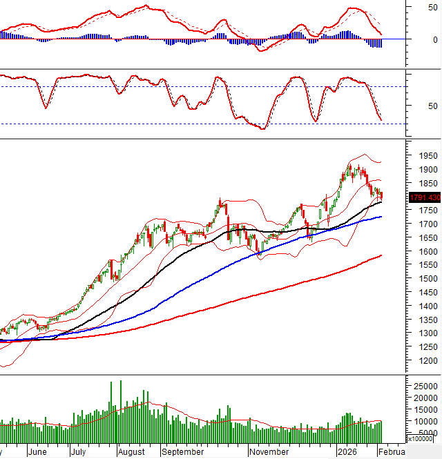 VN-Index đánh mất mốc 1,800 điểm và tiến sát đường SMA 50 ngày. Kết quả test ngưỡng này sẽ quyết định xu hướng của chỉ số trong thời gian tới. Hiện tại, MACD tiếp tục giảm mạnh sau khi cho tín hiệu bán. Nếu tình hình không có sự cải thiện và chỉ báo cắt xuống ngưỡng 0 trong các phiên tới thì rủi ro sẽ gia tăng đáng kể.
