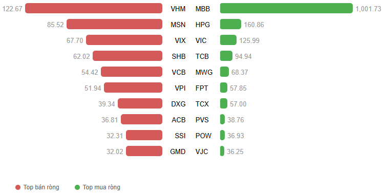 VN30-Index tăng 7.54 điểm (+0.38%), lên mức 1,979.53 điểm. Độ rộng của rổ khá phân hóa với 16 mã tăng, 10 mã giảm và 4 mã đứng giá. Trong đó, MBB là điểm sáng nổi bật nhất với mức tăng 4.7%. Đây cũng là cổ phiếu dẫn đầu danh sách mua ròng của khối ngoại với giá trị hơn 1,000 tỷ đồng trong phiên hôm nay. Trái lại, VJC chịu áp lực chốt lời mạnh với mức giảm 3.7%, cùng VNMSAB cũng điều chỉnh 1.9% mỗi mã.