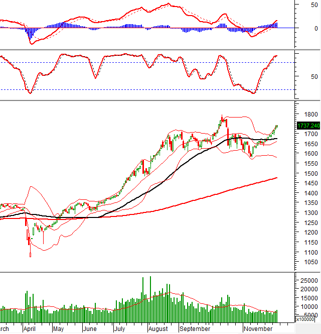VN-Index vẫn giữ vững chuỗi tăng sau diễn biến giằng co trong phiên và bám sát Upper Band của Bollinger Bands. Khối lượng giao dịch duy trì trên mức trung bình 20 ngày trong khi chỉ báo MACD tiếp tục nới rộng khoảng cách với đường Signal, qua đó củng cố triển vọng tích cực của chỉ số trong ngắn hạn và hướng đến đỉnh cũ tháng 10/2025 (tương đương vùng 1,760-1,795 điểm).