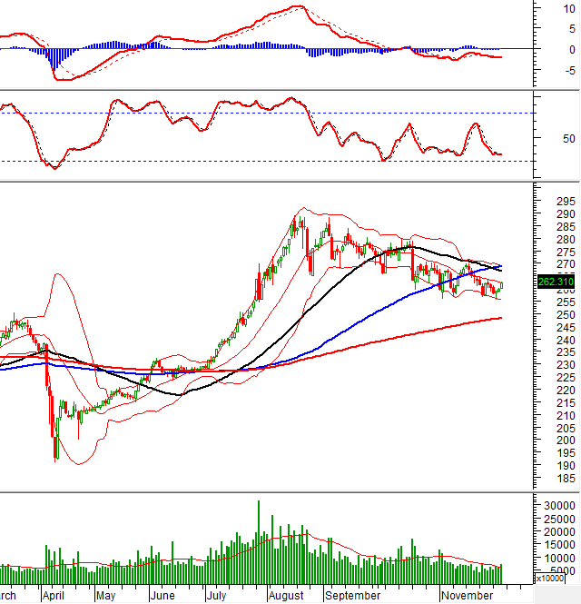 HNX-Index hồi phục phiên thứ 3 liên tiếp với sự xuất hiện của mẫu hình nến Big White Candle. Chỉ số đang tiến sát đường Middle của Bollinger Bands kèm khối lượng giao dịch vượt lên mức trung bình 20 ngày.